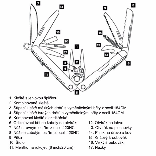 Menšie a teda ľahšie a skladnejší súrodenec Super Tool 300, ktorý sa však so svojimi 17-timi nástrojmi rozhodne nestratí ani v dielni, na chate, v kempe alebo trebárs na cestách. Všetky nástroje sú prístupné zvnútra, čepele nožov a pílky samozrejme vybavené poistkou proti nechcenému zatvoreniu. Vymeniteľné brity štiepačiek. Nástroj je vrátane čepeľou hlboko eloxovaný, a preto zostáva jeho čierna patina rovnaká aj po rokoch používania. Typický elegantný dizajn, bezchybné spracovanie a výborná funkčnosť sú štandardy firmy Leatherman, vďaka ktorým môže svojim zákazníkom ponúknuť nadštandardnú záruku. U nás kúpite iba originálny kus z oficiálnej distribúcie, na ktorý po registrácii svojho výrobku získate záruku 25rokov ! Materiál čepele: 420HC Stainless Steel - nerezová oceľ so zvýšeným obsahom uhlíka, vysoko odolné ostrie. Materiál klieští: 154cm Stainless Steel - vysoko legovaná nerezová oceľ so zvýšeným obsahom uhlíka.